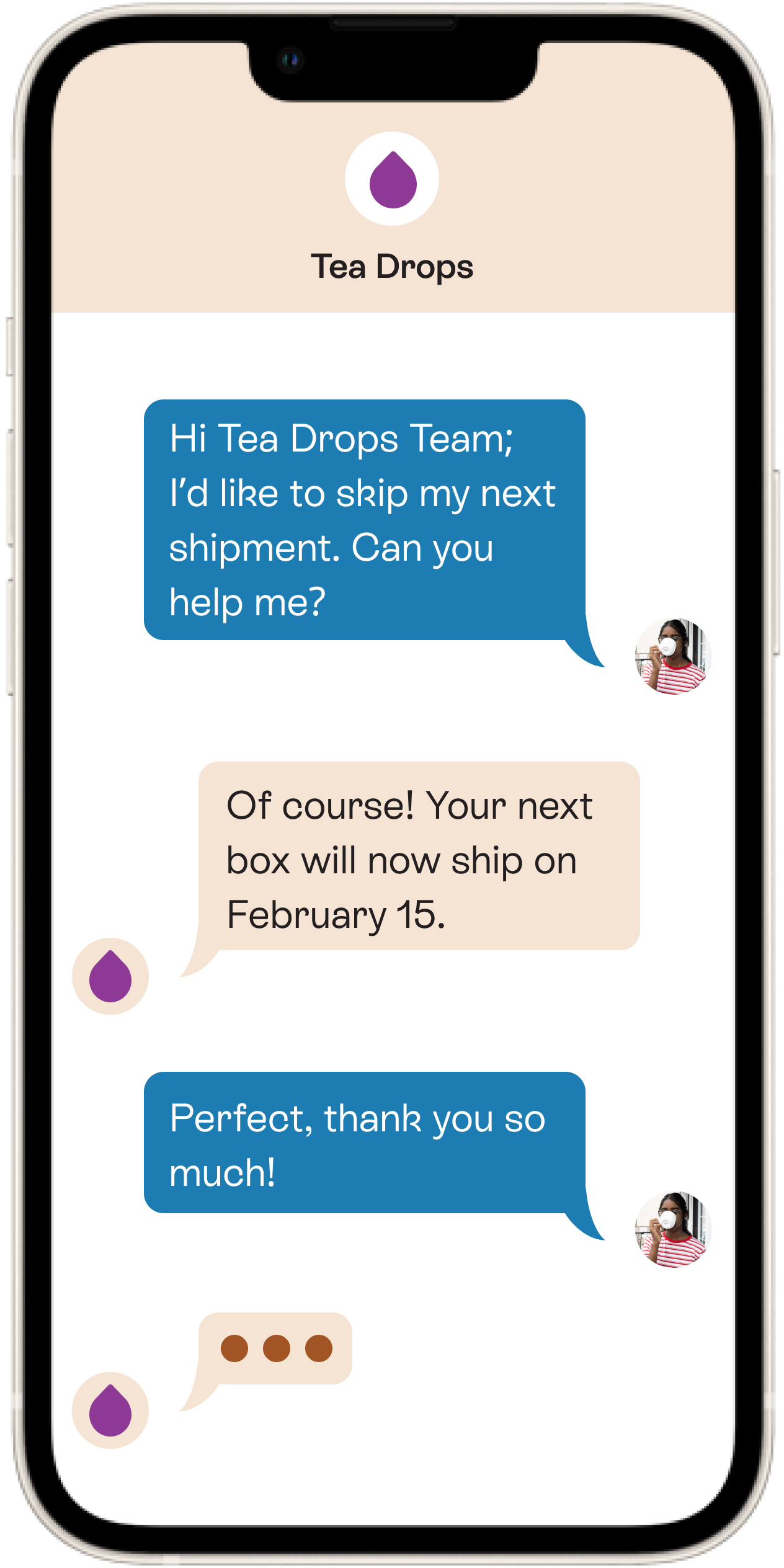 Pause your subscription, skip a box, or ask questions instantly, all over text. Or just send us tea puns. We love those too.